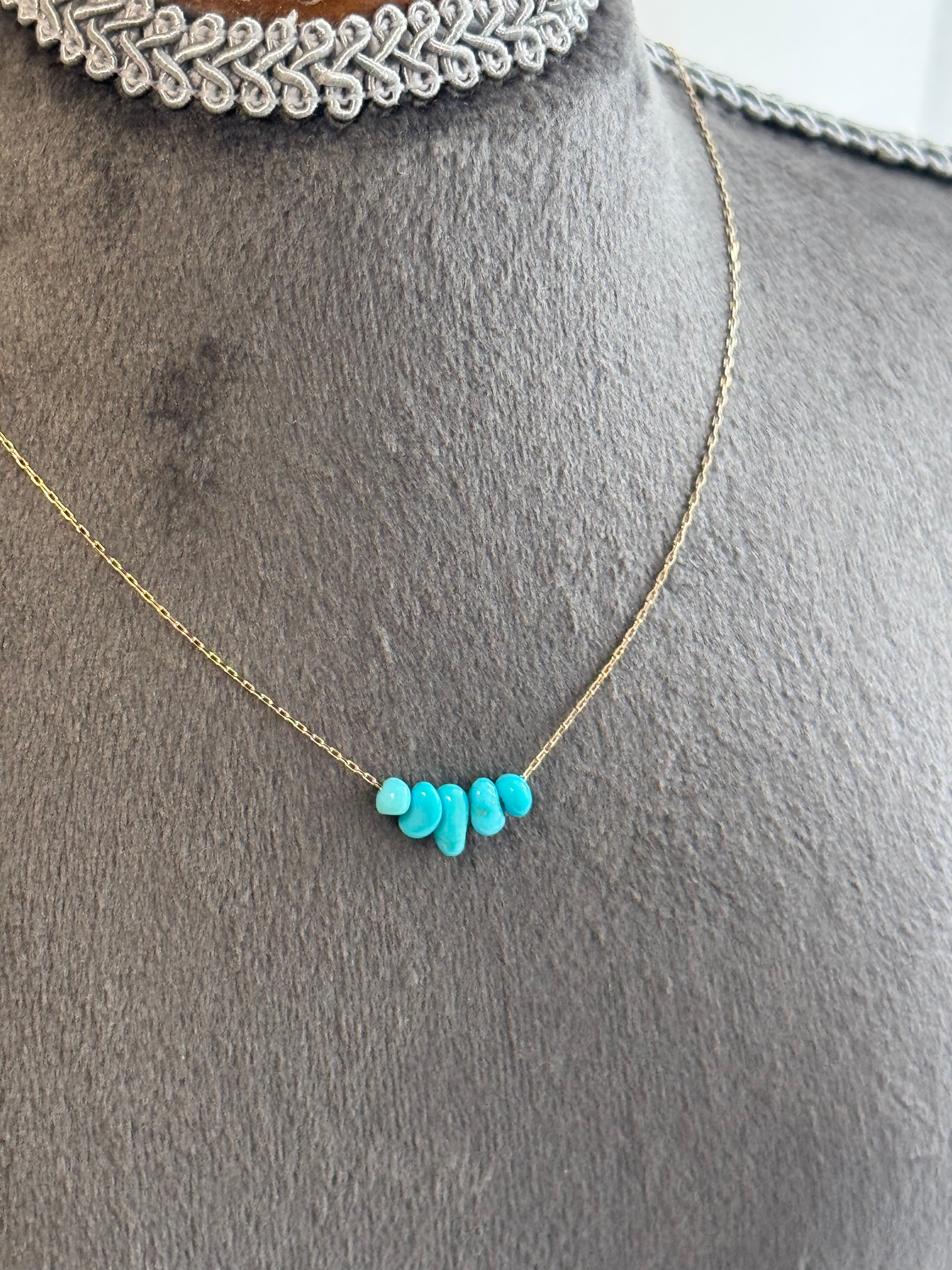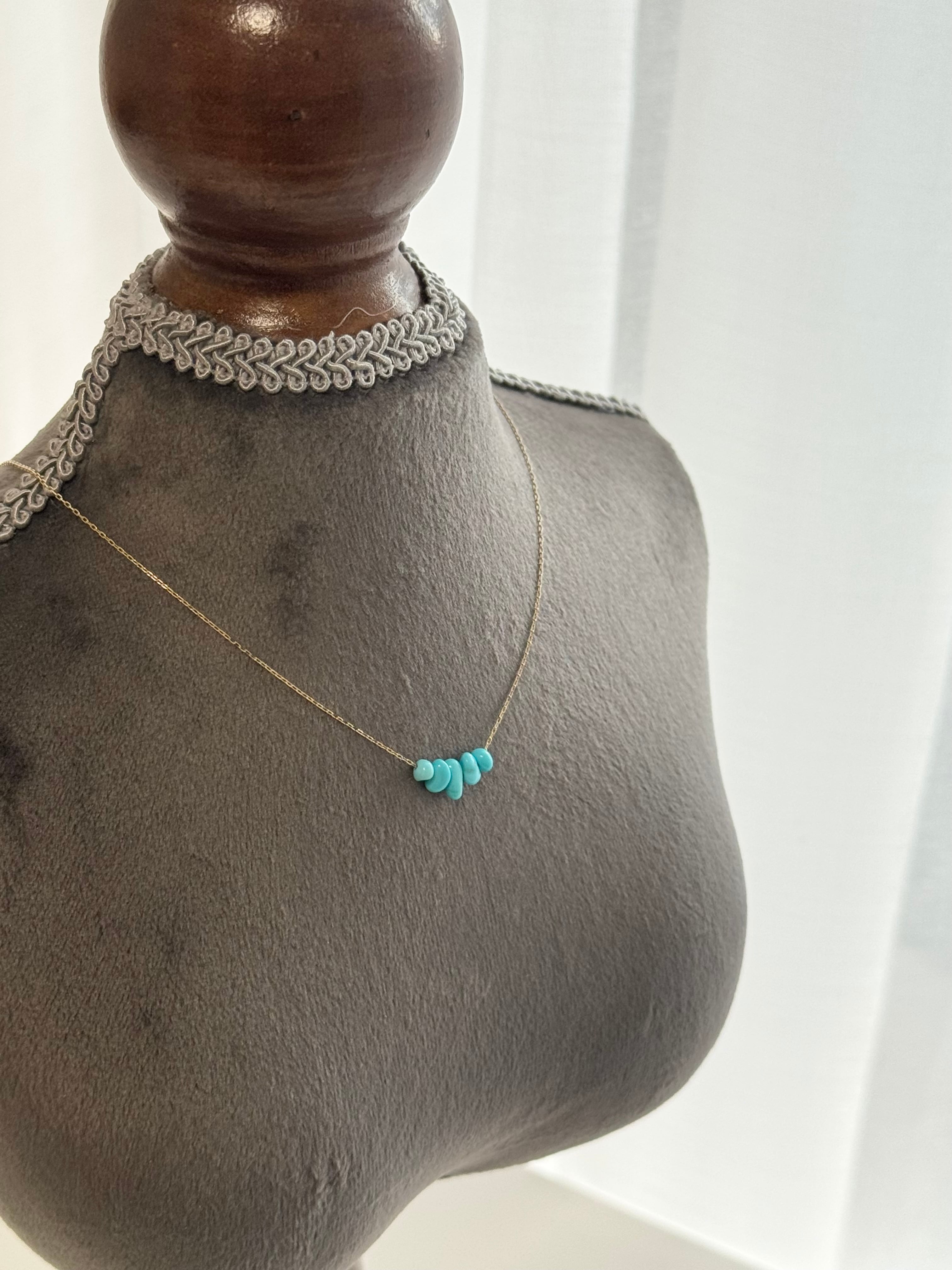 タンブルカットのスリーピングビューティーターコイズを5粒、パランス良く並べたK10ネックレス。