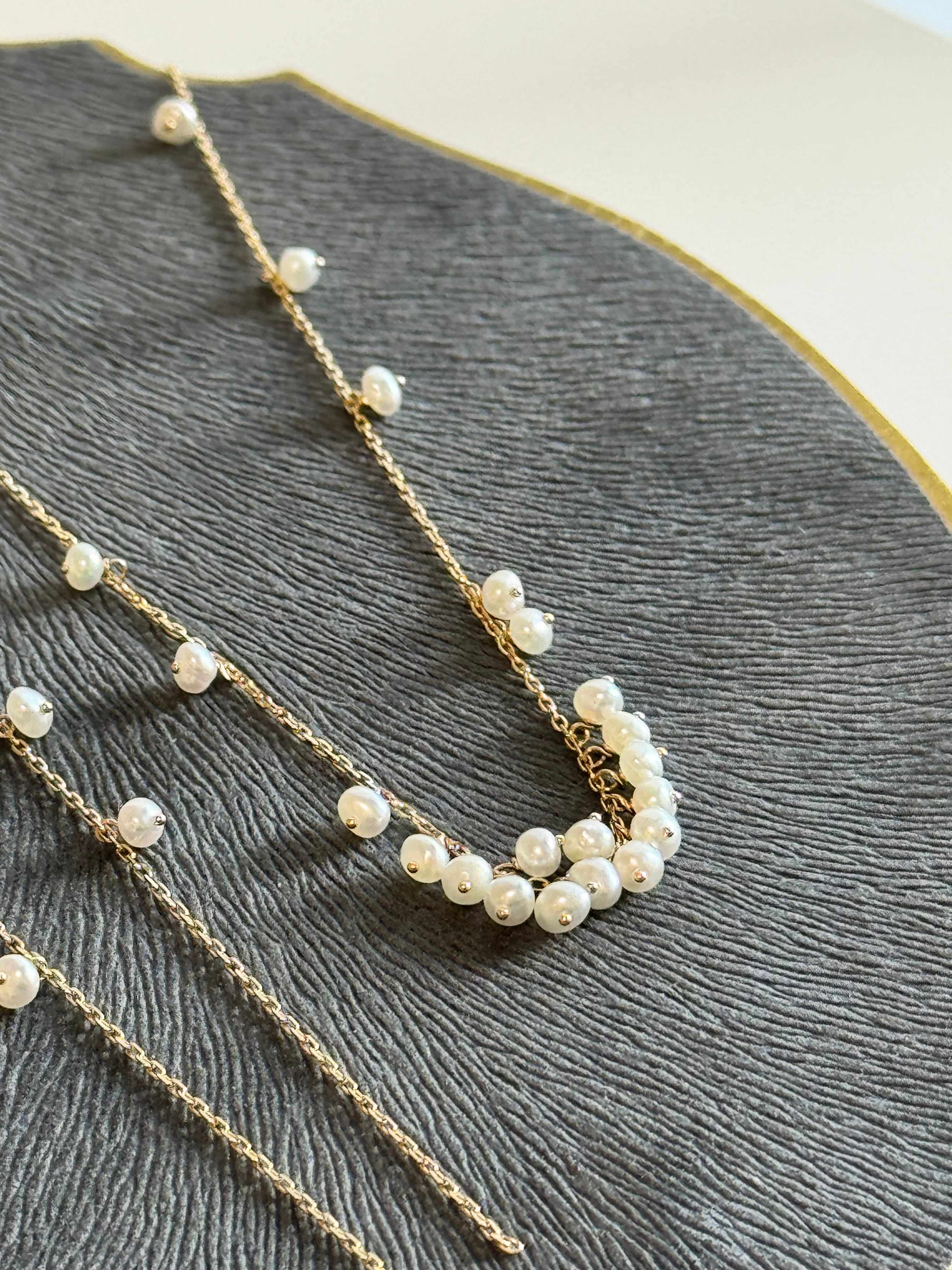ネックレスチェーンにランダムにパールを配置して動きを持たせたデザインにしています。