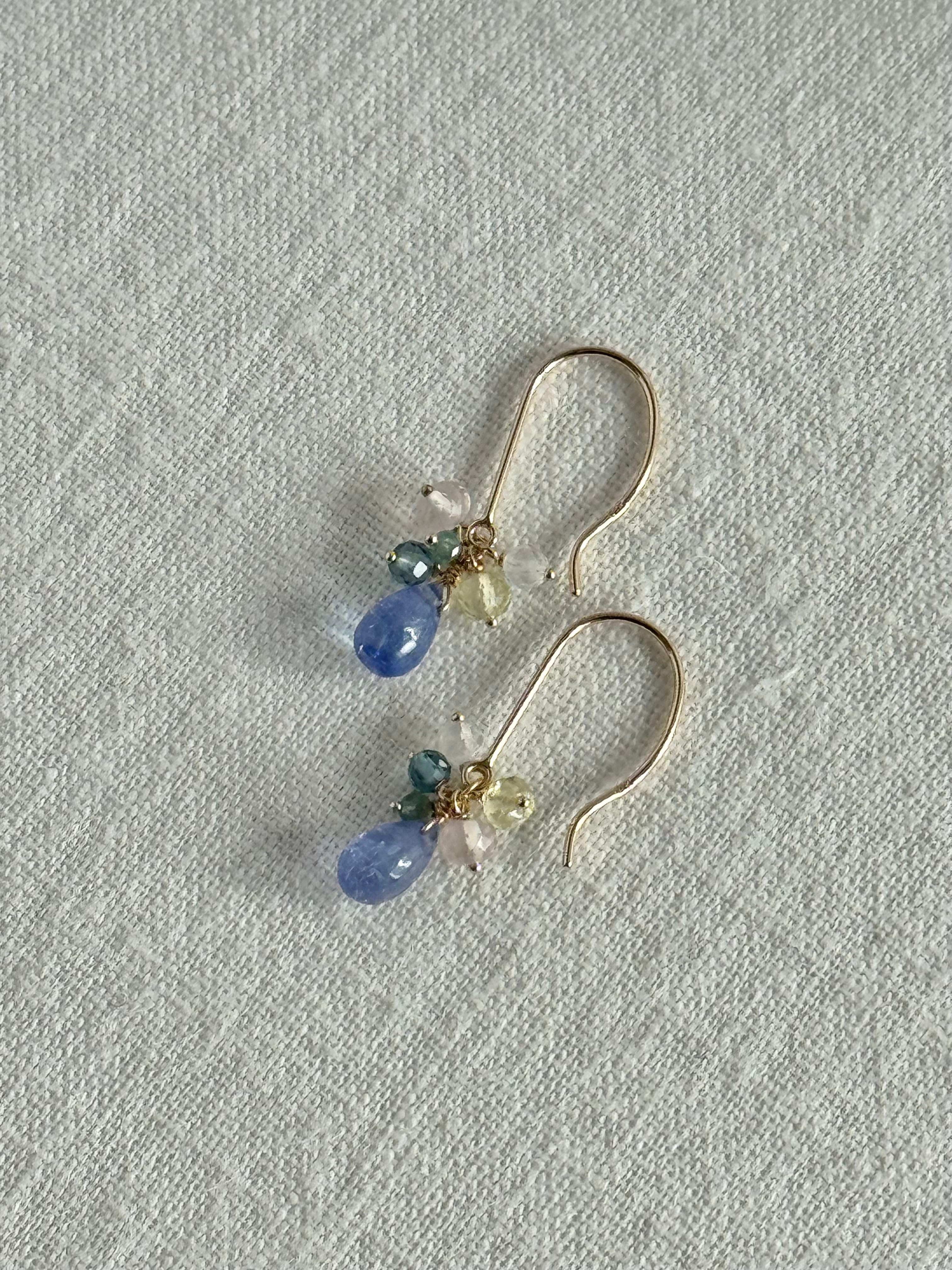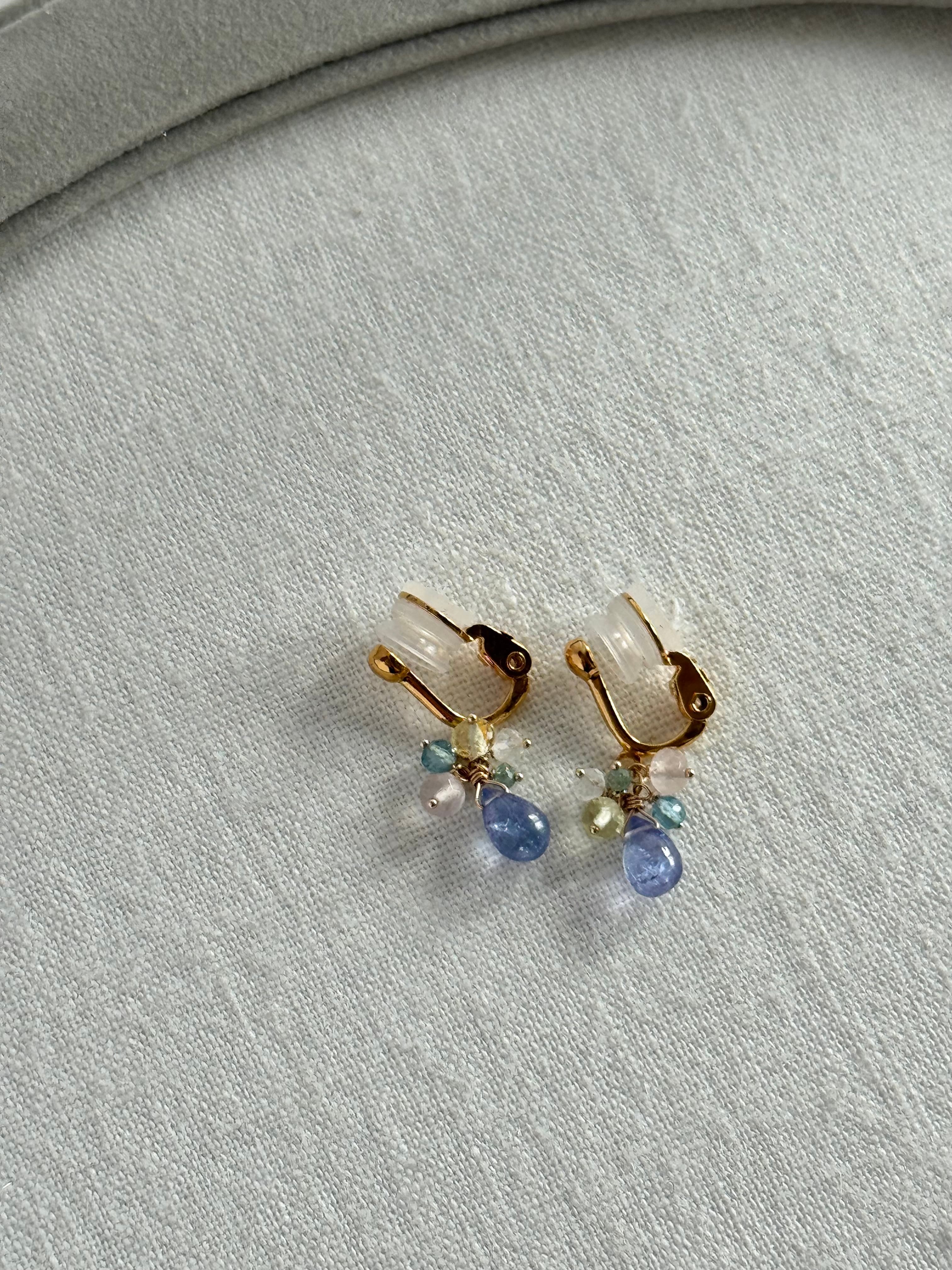 スムースドロップカットの小粒タンザナイトに優しい色みの小粒石を合わせてまるでブーケのようなピアス・イヤリングになりました♪