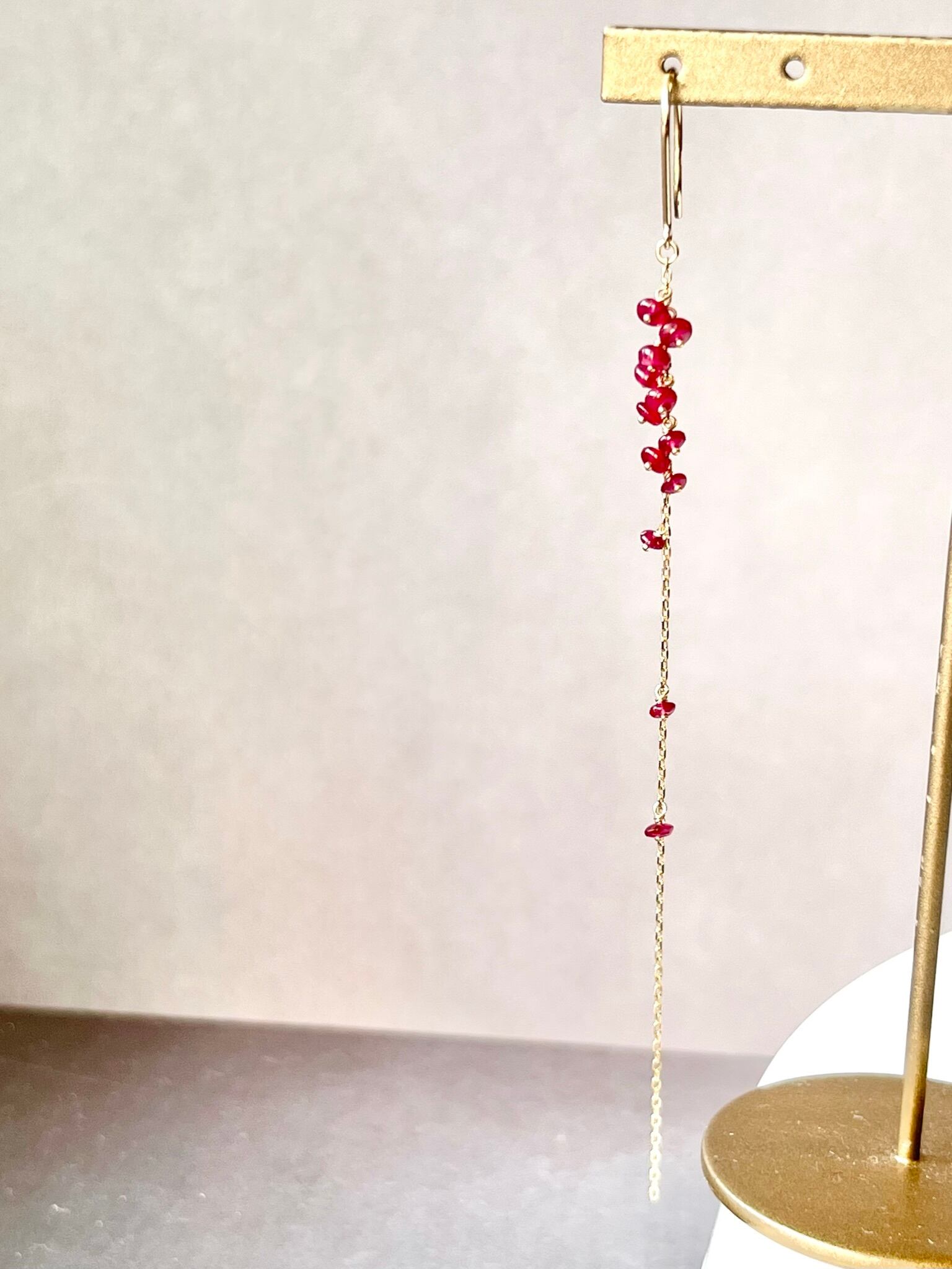 こっくりとした赤のロンデルルビーをこぼれ落ちるようなデザインに取り付けたロングピアスです。