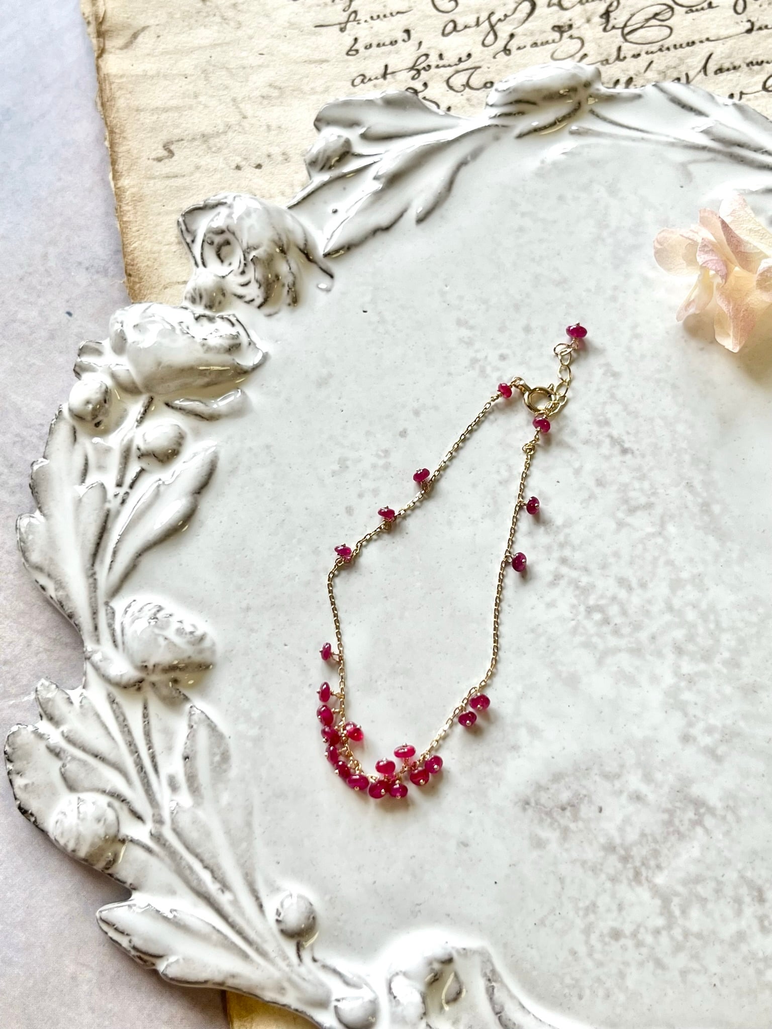 こっくりした赤いロンデルのルビーをたっぷりふんわり取り付けたブレスレット。